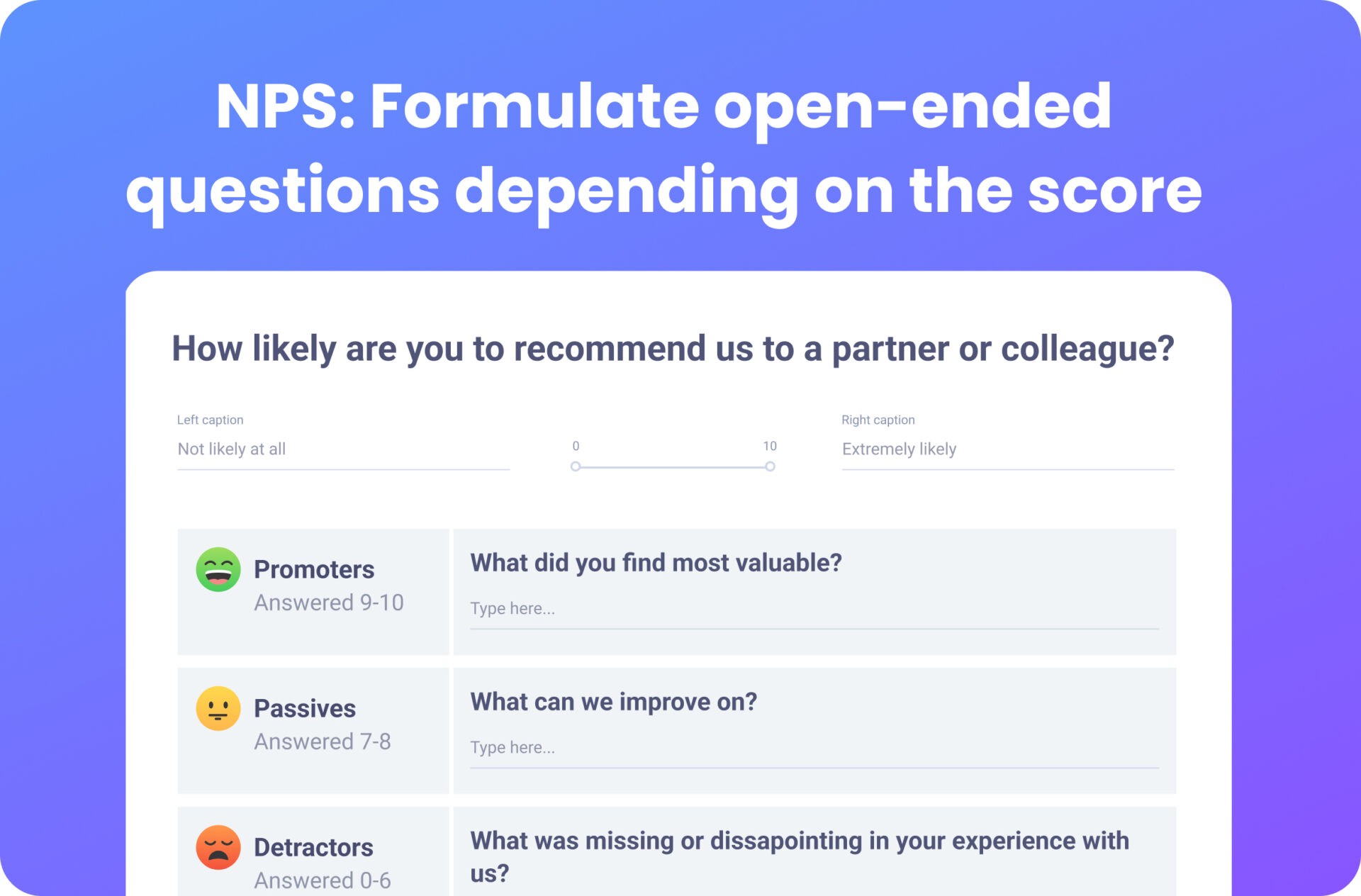 Open-ended NPS survey questions will highlight what makes promoters love the work environment or product and why detractors, on the other hand, have a hard time connecting with it. Hence, B2B companies can use the insights from their Net Promoter Score to tweak their approach, provide a more well-rounded and personalized experience, and attract high-quality candidates.